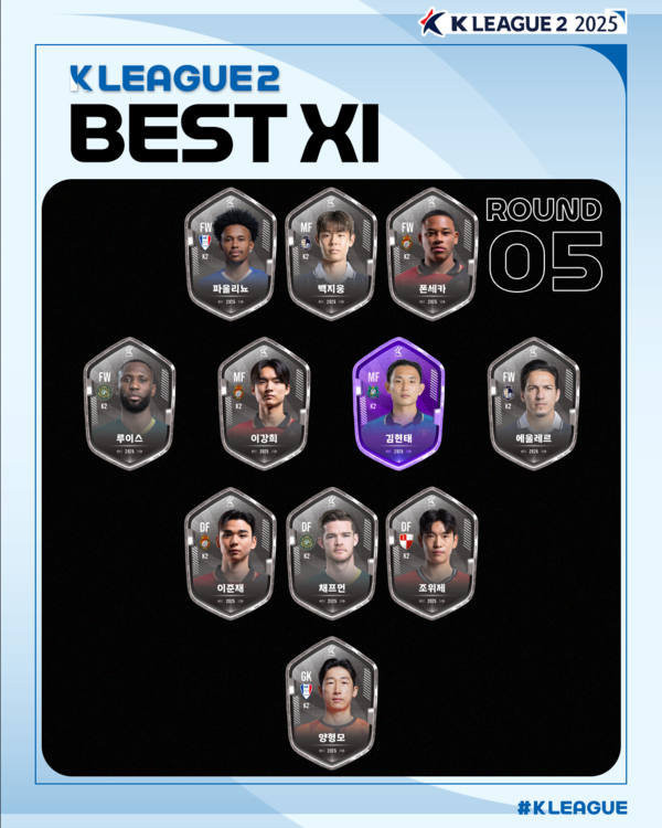 K리그2 5라운드 MVP는 안산그리너스 김현태가 차지했다. 김현태는 29일 안산와~스타디움에서 열린 안산과 화성FC 경기에서 해트트릭을 기록하는 맹활약을 펼쳤다. 김현태는 전반 추가시간과 후반 추가시간 세트피스 상황에서 머리로 두 골을 터뜨렸고, 경기 종료 직전 강력한 오른발 슛을 성공시키며 이날 안산이 기록한 세 골을 모두 책임졌다. 경기는 3-3 무승부로 끝이 났다.