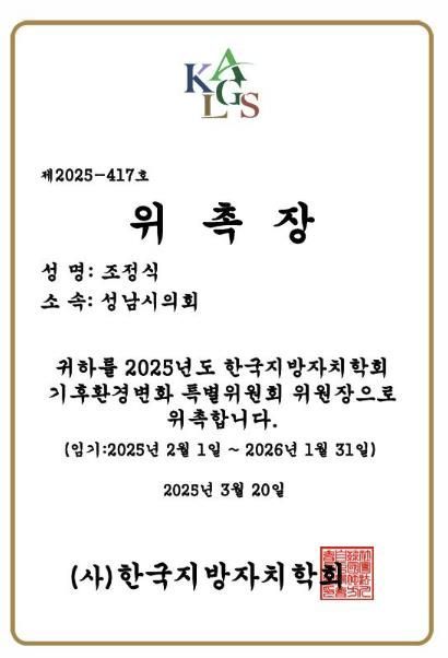 [와이뉴스] 성남시의회 조정식 의원이 (사)한국지방자치학회의 2025년도 기후환경변화 특별위원회 위원장으로 위촉됐다. 임기는 2025년 2월 1일부터 2026년 1월 31일까지다.