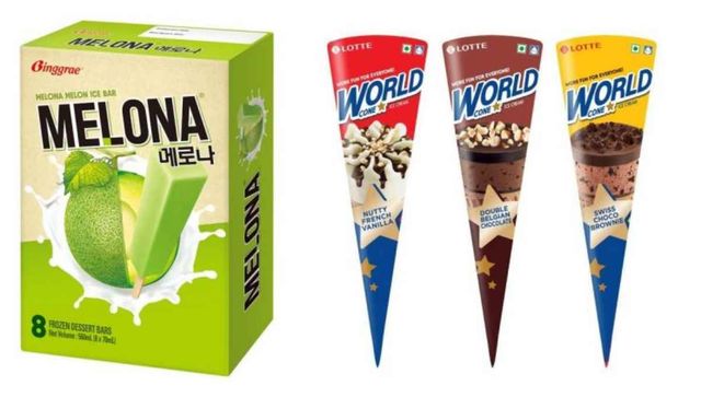 빙그레 '메로나' 수출제품(왼쪽), 인도서 판매 중인 롯데웰푸드의 '월드콘' / 빙그레, 롯데웰푸드