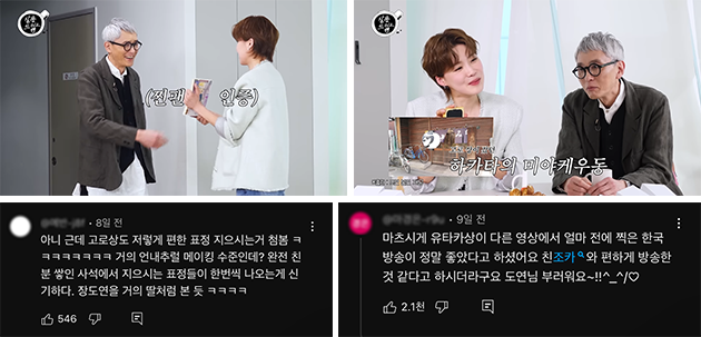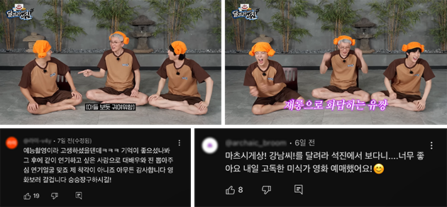 시청자들은 댓글을 통해 “예능 촬영이라 고생하셨을 텐데 기억이 좋으셨나 봐요 그 후에 같이 연기하고 싶은 사람으로 대배우와 진을 뽑아주심”(유튜브, 라****), “마츠시게 상, 강남 씨를 달려라 석진에서 보다니... 너무 좋아요 내일 고독한 미식가 영화 예매했어요!”(유튜브, ar*******) 등 세 사람의 케미와 이로 인한 웃음에 뜨거운 반응을 보였다.