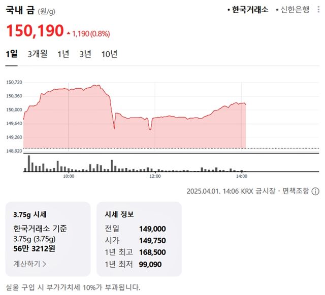 국내 금시세(금값)가 1일(한국 시각) 오후 상승세(전 거래일 대비)를 보이고 있다.