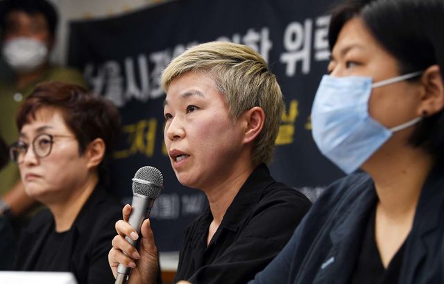 김재련 변호사가 2020년 7월 13일 서울 은평구 한국여성의전화 교육관에서 연 '서울시장에 의한 위력 성추행 사건 기자회견'에서 사건 경위를 설명하고 있다. 당시 피해자는 박원순 당시 서울시장에게 4년 동안 지속적으로 성추행을 당했다고 주장했다. / 2020년 7월 13일자 뉴스1 사진