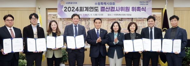 [와이뉴스] 수원특례시의회가 1일 의장 집무실에서 ‘2024회계연도 결산 검사 위원 위촉식’을 진행했다. 이날 시의회는 결산 검사 위원으로 수원특례시의회 사정희 의원과 이대선 의원, 민간 위원으로 박연희·서현일·양헌태·이상준 세무사와 이수승 회계사 등 총 7명의 위원을 위촉했다.