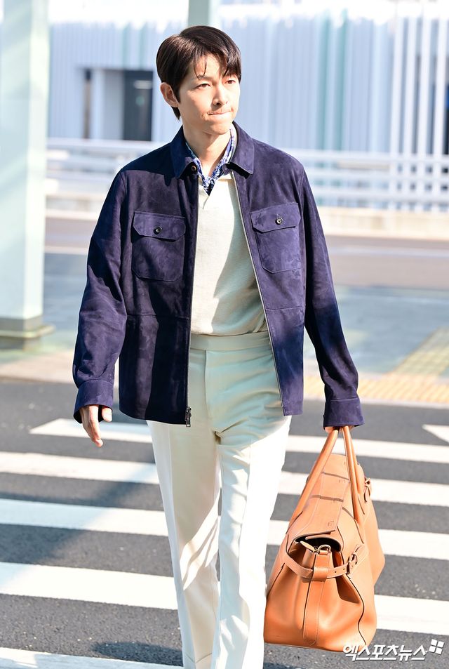 이날 송중기는 봄을 알리는 듯한 화사한 올 화이트 룩으로 깔끔한 공항 패션을 선보였다. 여기에 남색 스카프와 재킷으로 포인트를 줘 남다른 패션 센스를 발휘했다.