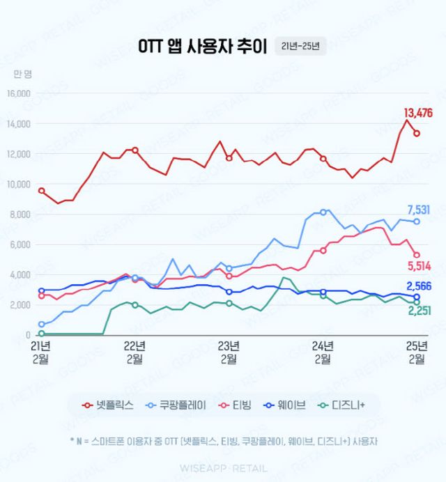 쿠팡플레이는 지난 2023년부터 올 2월까지 월활성사용자수(MAU)기준 국내 OTT 시장에서 연속 1위를 기록하고 있다.