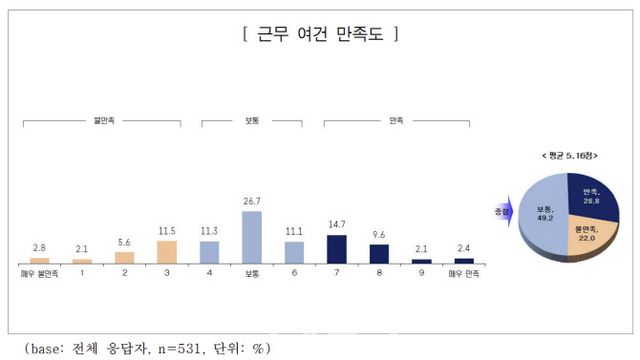 세부적으로 살펴보면 종사자 응답자의 53.8%가 급여 및 보수 수준이 불만인 것으로 나타났다. 다음으로 △근무강도가 24.8% △직무 스트레스 △10.3% △근무환경 6.0% △타부서와의 협업 및 소통 4.0%였다.