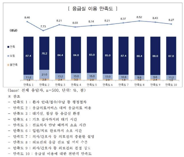 응급실 이용자 또한 ‘비용’에 민감했다. 환자와 보호자를 대상으로 응급의료서비스에서 개선이 필요한 사항을 조사한 결과 응답자의 36.4%가 ‘비싼 응급실 이용을 개선해야 한다’고 답했다. 그 뒤를 이어 △진료까지의 소요되는 대기 시간(29.4%) △응급실 진료과 부족(소아·외상 등)(24.0%) △집 근처 이용 가능한 응급실 부족(20.0%) 순으로 나타났다.