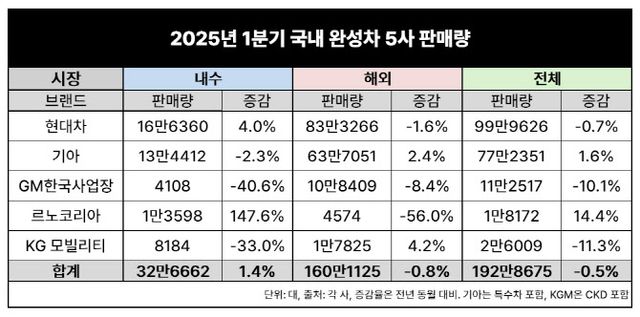 1일 국내 완성차 5개사에 따르면 올해 1분기(1~3월) 국내외 판매량은 총 192만 8675대로 지난해보다 0.5% 감소했다. 같은 기간 내수 판매량은 32만 6662대로 1.4% 늘어나며 회복 흐름을 보였다. 수출 물량은 160만 1125대로 지난해 같은 기간보다 0.8% 줄었다.