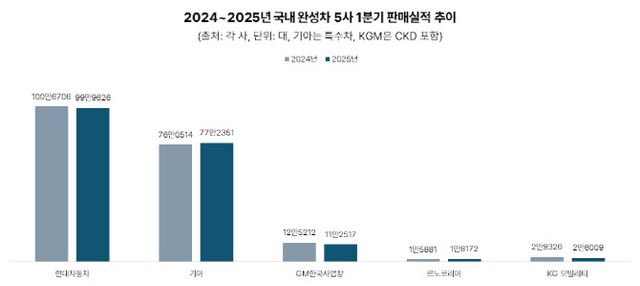 3월 한 달만 보면 국내 5개사 글로벌 판매량은 지난해 같은 달 대비 1.2% 줄어든 70만 2853대다. 내수 판매가 2.2% 늘어난 12만 3817대를 기록하며 두 달 연속 증가 흐름을 보였다. 수출은 1.9% 감소한 57만 8708대로 주춤했다.
