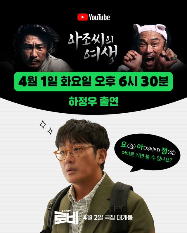개봉까지 단 하루를 남긴 ‘로비’는 열혈 홍보 릴레이를 이어간다. 먼저 1일 오후 6시 30분에 유튜브 ‘추성훈’ 채널에 하정우가 출연한다. 최근 ‘유튜브 아조씨’로도 변신한 종합 격투기 선수 추성훈이 운영하는 구독자 151만 보유 인기 유튜브 채널이다.