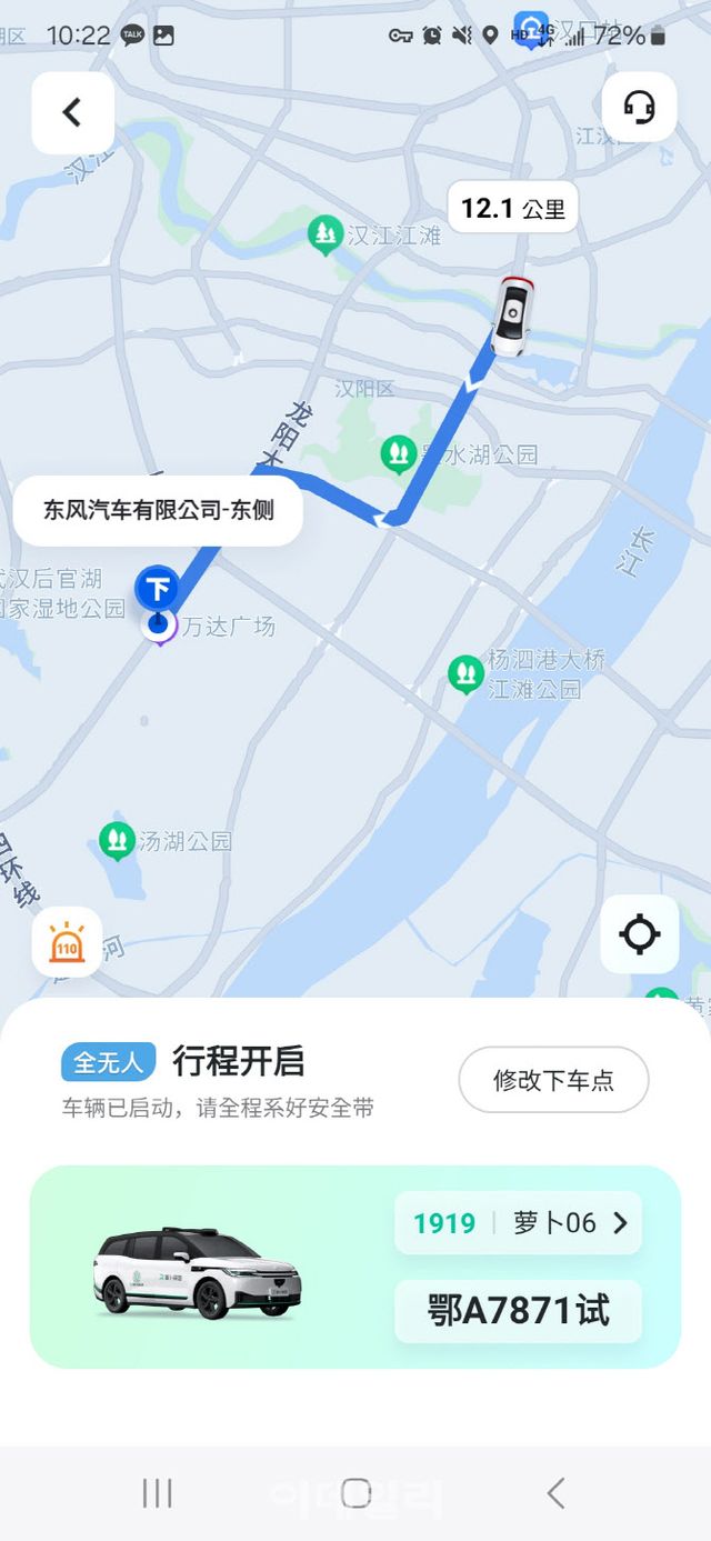 [우한(중국)=이데일리 이명철 특파원] 중국 후베이성 우한시의 한 도로. 스마트폰 앱을 이용해 바이두의 로보택시 ‘아폴로’를 호출했다. 호출과 동시에 배차된 로보택시는 10여분만에 지정된 승차 장소에 도착했다. 승객을 태우고 자유자재로 핸들을 움직여 차선에 진입하더니 주행을 시작했다. 직선 주행은 물론 좌·우회전, 유턴, 차선 변경까지 자연스러웠고 앞에서 한 차량이 진입하려고 하자 경계의 의미로 경적을 울리기도 했다.