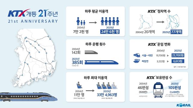 지난 21년간 KTX는 대한민국 대표 교통수단으로 자리매김하며 누적 이용객 11억 4천만 명을 돌파하고 총 6억 9천만 km를 운행하는 대기록을 세웠다. 이는 전 국민이 KTX를 23번씩 이용하고, 지구 둘레를 1만 7천 바퀴 돈 것과 맞먹는 거리다.