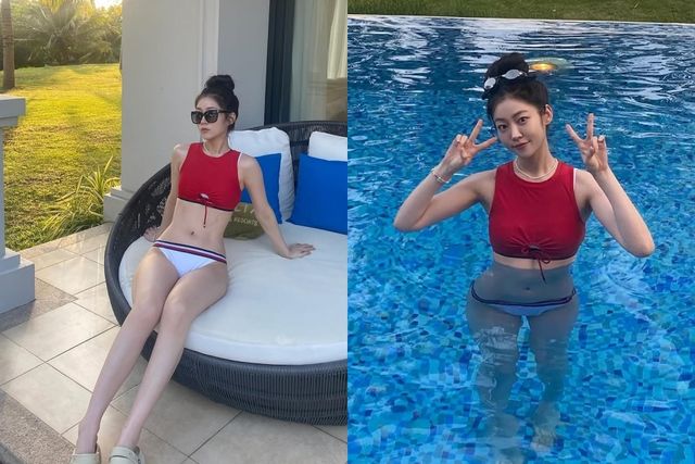 공개된 사진 속 송지우는 나트랑 여행 중 야외 수영장에서 여유를 즐기고 있는 모습이다. 레드 브라톱 비키니에 화이트 스윔 팬티를 입은 송지우는 슬림한 몸매 사이 돋보이는 골반 라인으로 눈길을 사로잡았다. 특히 수영장 안에 들어가 있음에도 불구하도 도드라진 유려한 S라인이 감탄을 자아냈다.