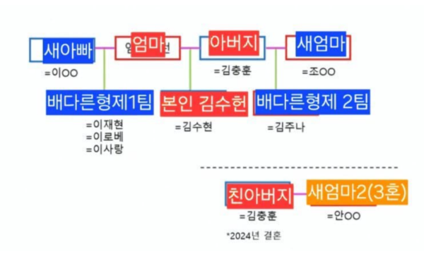 김수현의 어머니는 과거 남편과 이혼 후 김수현을 홀로 키워왔다. 이후 김수현의 아버지 김충훈은 다른 여성과 재혼해 김주나를 얻었고, 최근에는 또 다른 여성과 세 번째 결혼을 올린 것으로 전해졌다.
