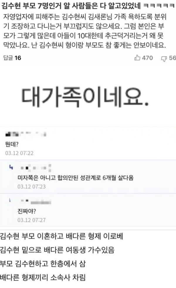 대중의 시선을 더욱 끈 것은 김수현의 가족관계가 이번 김새론과의 논란에서 일정 부분 영향을 미쳤다는 점이다. 김수현이 김새론과의 논란으로 궁지에 몰리면서 일부 네티즌들은 그의 가족 배경과 소속사 경영 구조에까지 의혹의 눈초리를 보내고 있다.