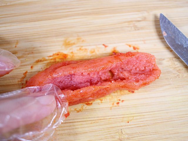 명란젓 가운데 칼집을 넣어서 가른 뒤에