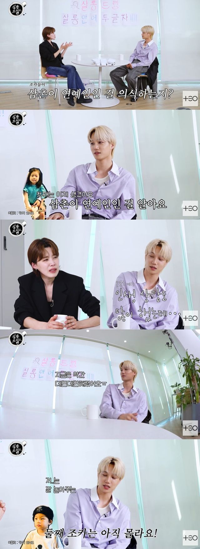 이에 장도연은 "조카가 삼촌이 연예인이라는 인식이 생겼지 않냐"라고 물었고, 카이는 "첫째는 생겼다. 연예인인 걸 확실히 안다"고 답했다.