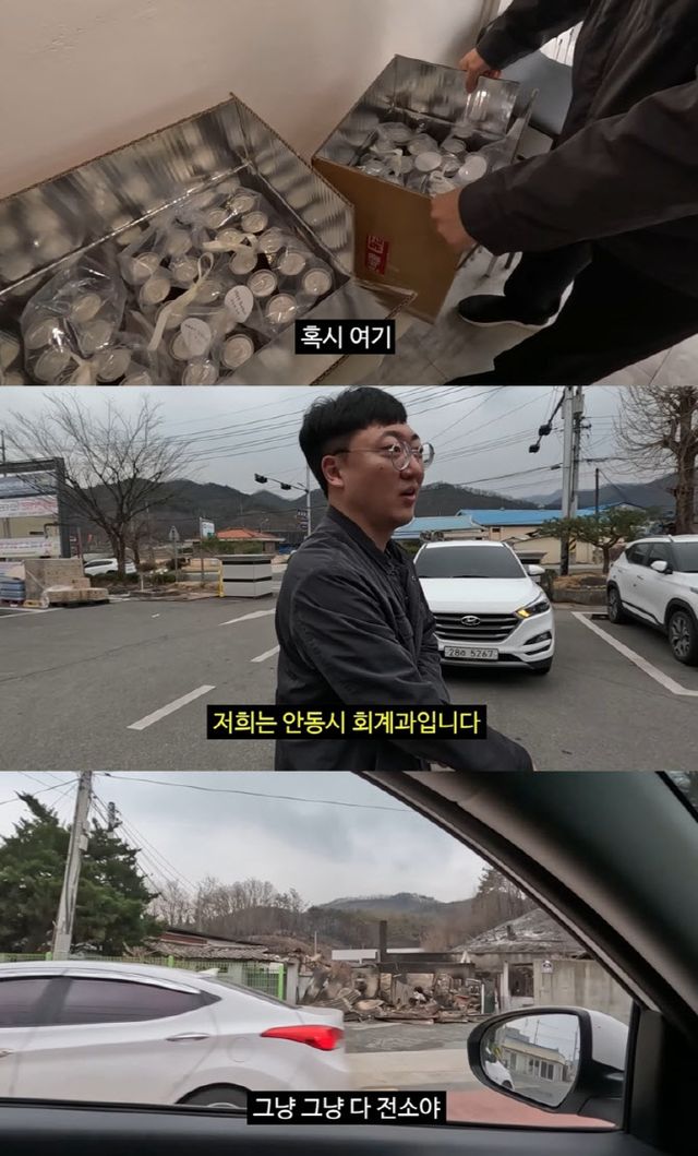 안동시가지 남쪽부터 돌기 시작한 김 주무관은 차로 이동하던 중 불타버린 산과 전소된 건물 등을 보고 탄식하기도 했다. 김 주무관은 “임하면에 왔는데 생각보다 심각하다. 건물이 다 탔다. 아직도 불이 나고 있는 곳도 있다. 면사무소 앞까지 불이 번졌다”고 말했다.