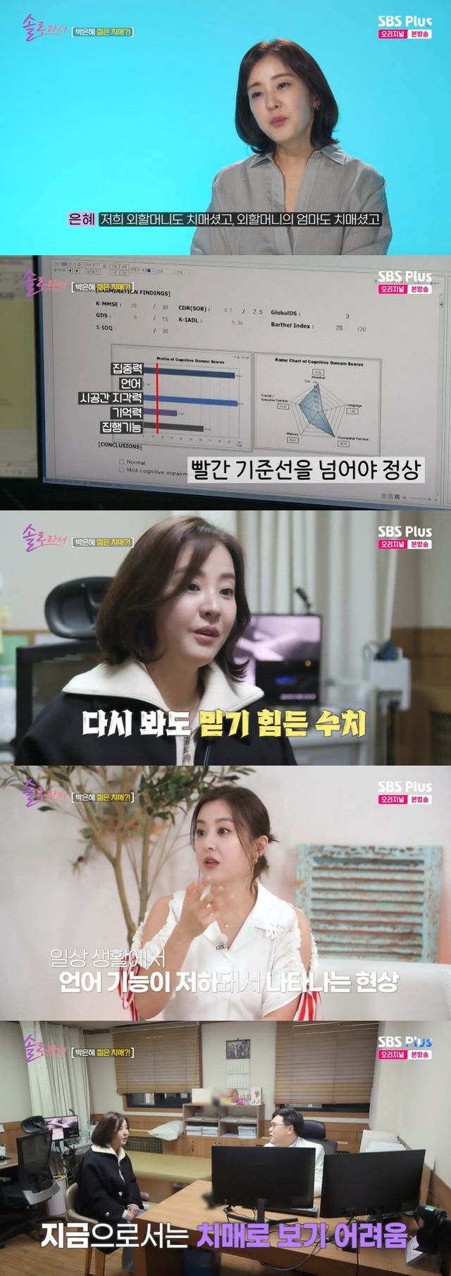 박은혜는 "외할머니도 치매셨고, 외할머니의 어머니도 치매셨다. 유전적인 게 있지 않을까 싶었다. 걱정보다는 각오를 하고 갔다"라며 치매 검사를 위해 병원을 찾았다고 밝혔다.