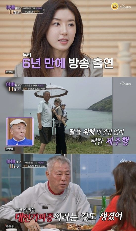 1일 방송된 TV CHOSUN '아빠하고 나하고'에서는 6년간의 공백을 깨고 방송에 복귀한 배우 박한별과 前 축구 감독인 그의 아빠가 출연했다. 이들은 육지를 떠나 함께 지내고 있는 제주도에서의 일상과 더불어 힘든 시간을 함께 견뎌낸 지난 6년간의 이야기를 들려줬다.
