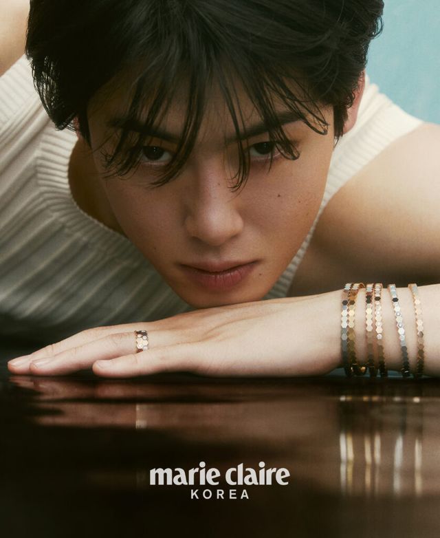 쇼메 링, 왼손 약지의 브릴리언트 컷 다이아몬드를 하프 파베 세팅한 로즈 골드 비 드 쇼메 링과 화이트 골드 비 드 쇼메 링, 왼 손목의 각각 화이트 골드, 옐로