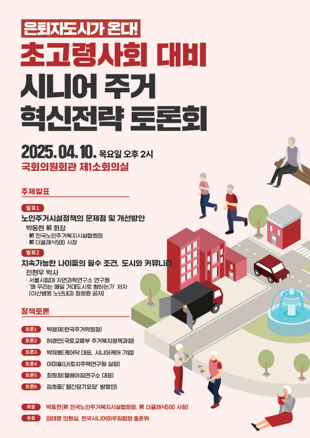 이번 토론회는 엄태영 국민의힘 의원과 한국시니어하우징발전협회 출준위 공동주최로 열린다. 엄태영 의원은 여야 합동 국회의원 연구모임 ‘국회 은퇴자도시 연구포럼’ 소속으로, 안정적 노후를 위한 시니어 주거 시설 도입 및 활성화에 앞장서고 있다. 한국시니어하우징발전협회 역시 정부와 주요 시니어 하우징 기업, 기관이 모이는 시니어 주거 정책 협력 기구로 올해 공식 발족을 앞두고 있다.