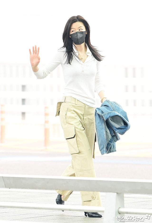 이날 전지현은 슬랜더 몸매를 뽐내는 화이트 카라 니트에 베이지 카고 팬츠를 매치한 공항패션을 선보였다. 오른손에 든 데님 재킷이 여유로운 무드를 더했다.
