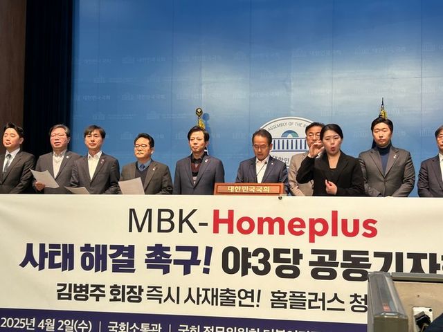 2일 오전 국회 정무위원회 소속 야 3당은 'MBK-홈플러스 사태 해결 촉구' 공동 기자회견을 열었다. =배예진 기자