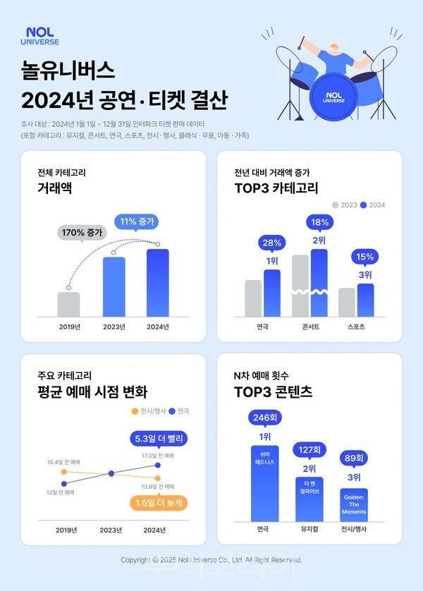 놀유니버스의 '2024년 주요 지표 및 소비 트렌드'에 따르면, 공연·티켓 판매 건수 역시 전년 대비 10%, 2019년 대비 136% 증가하며 지속적인 성장세를 보였다.
