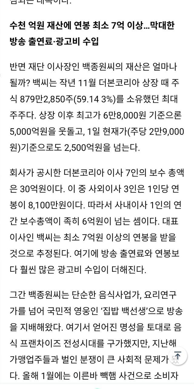 사립학원 특성상 학원에 대한 운영비를 백종원이 지급하지 않고 그 금액을 국민 세금으로 충당하고 있었고 그 금액이 무려 최소 50억 이상이라고 함