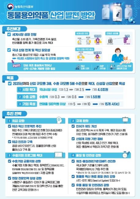 농식품부는 2035년까지 산업 규모를 3배(’231.3→’354.0조 원), 수출 규모를 5배(’230.3→’351.5조 원) 수준으로 확대한다는 목표로 연구개발(R&D) 강화, 규제 혁신, 수출지원 프로그램 등 확대, 품질 및 안전성 강화를 4대 전략으로 하여, 연구개발(R&D) 혁신 프로젝트 추진, 신속 허가(패스트트랙) 체계 구축, 산업 육성법 제정, 제조·품질관리기준(GMP) 선진화 등 10개 세부 과제를 추진한다는 계획이다.
