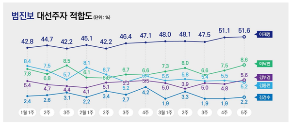 범진보 대선주자 적합도 조사 결과 더불어민주당 이재명 대표가 51.6%를 기록하며 압도적 1위를 차지했다.