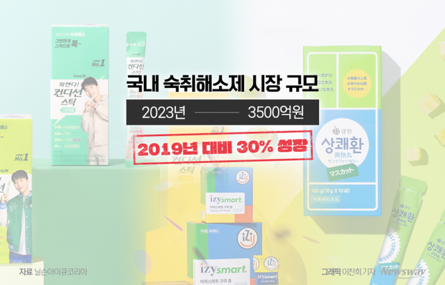 시장조사기업 닐슨아이큐코리아 등에 따르면 지난해 국내 숙취해소제 시장 규모는 2019년 2678억원에서 지난 2023년 기준 약 3500억원으로 30% 성장했다. 판매액은 지난해 기준 3474억원으로 전년 3144억원에서 10.4% 증가했다.