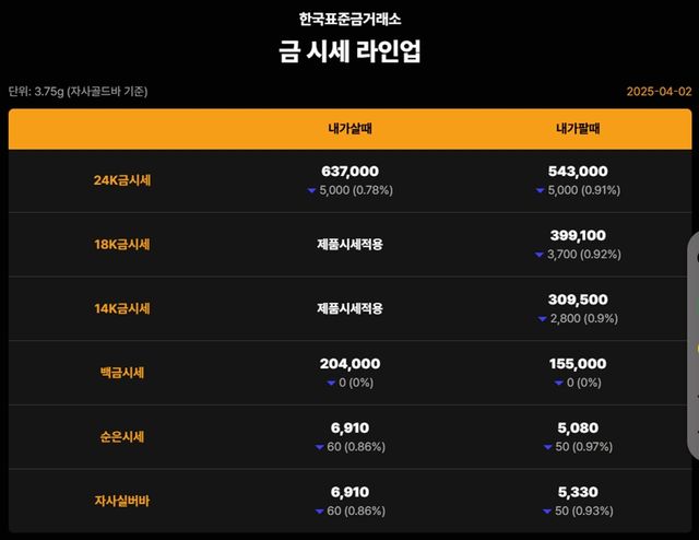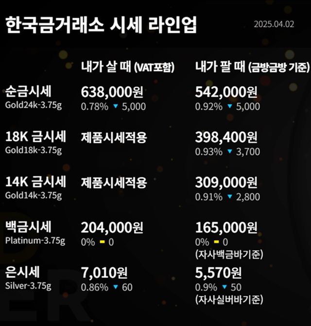 순금(24K) : 매입가 63만 8000원 / 매도가 54만 2000원
