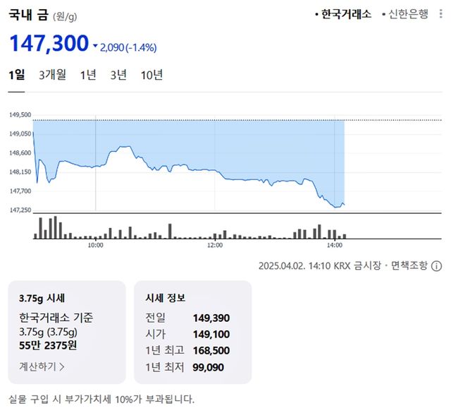 국내 금시세(금값)가 2일(한국 시각) 오후 하락세(전 거래일 대비)를 보이고 있다.