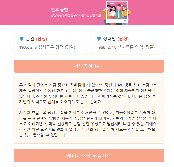 온라인 사주 전문 플랫폼 위키사주에서 운영하는 '깐부궁합'에 따르면 두 사람의 관계는 지금 중요한 전환점에 서있다. 진정한 친구는 서로가 마음을 나누고 배려하니 서로 노력해야 한다. 서로 마음을 솔직하게 나누고 이해하며 더욱 건강하고 균형 잡힌 우정으로 발전시켜나갈 수 있다.