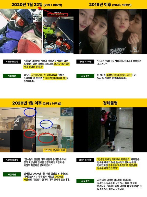 또한 가세연이 “2015~2016년 사이 촬영된 데이트 사진”이라며 공개한 스키장 사진 경우 김수현과 김새론뿐만 아니라 “2020년 골드메달리스트 임직원들과 단체 동행했을 때 찍은 것”이라며 당시 함께 한 임직원들이 함께 찍힌 사진을 첨부했다.