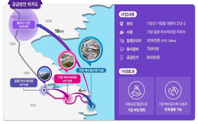 이로써 사업비 799억 원을 투입해 송수관 24킬로미터(km)를 설치하고, 기장 해수담수화시설의 핵심인 역삼투 시설을 개보수해 하루 3만6천 톤의 공업용수를 동부산 산단에 안정적으로 공급한다.