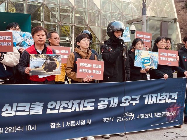 전국공공운수사회서비스노동조합은 2일 서울와치, 정보공개센터와 함께 서울시청 앞에서 기자회견을 열고 "서울시가 작년 8월 서대문구 싱크홀 사고 후 땅 꺼짐 위험도를 5단계로 평가한 '지반침하 안전지도'를 만들었지만 자치구와 공사 관계자 등에만 공유하고 비공개하고 있고, 이 속내는 부동산값 때문이라는 공공연한 이야기가 있다"며 "도로가 일상이고 일터인 운수 노동자들은 생명과 안전을 위해 지반침하 안전지도 공개를 요구한다"고 밝혔다.