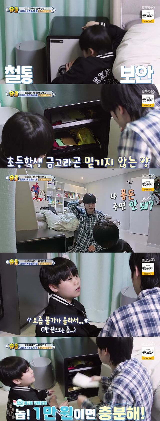 황민호가 금고를 열자 황민우는 "나 용돈 주면 안 돼?"라고 농담하더니, 금고에서 1만 원을 꺼내 건넸다. 이에 황민호는 "요새 물가가 올라서 1만원은 조금"라며 능숙하게 협상을 시도했지만, 황민우는 "충분하다"며 동생의 경제 관념을 신경쓰는 모습을 보였다.