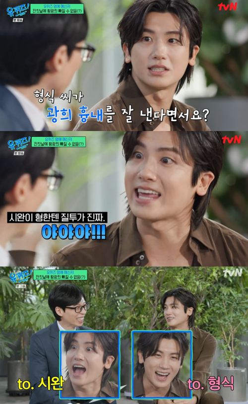 이어 “임시완 형에게 하는 건 또 다르다. 시완이 형에게는 질투가 있어서”라며 “‘야야야 너가 거길 왜 나가!’”라면서 달라진 황광희의 모습을 흉내 내 폭소를 안겼다.