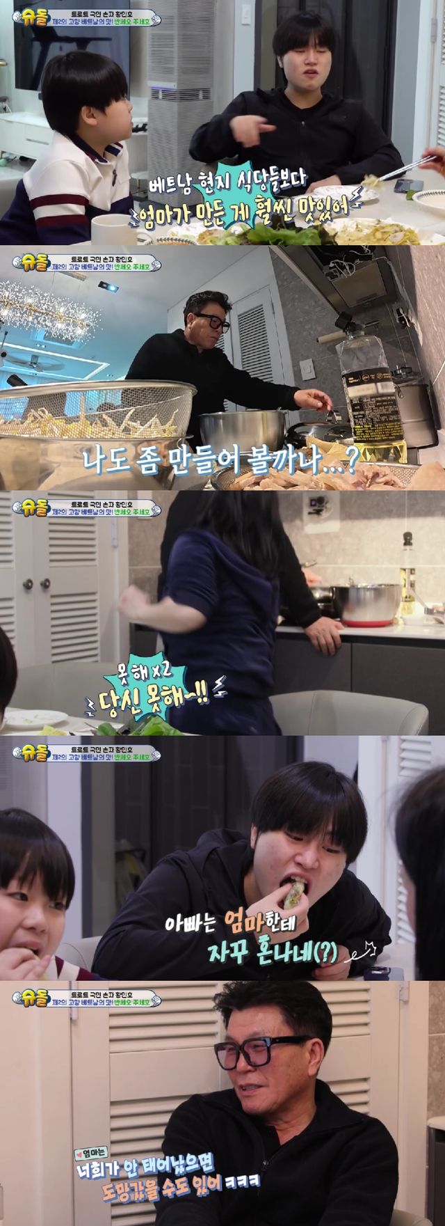 아버지가 요리에 도전하려 하자 어머니는 단호하게 “당신 못 해”라며 만류했다. 이를 지켜보던 황민우는 “아빠는 엄마한테 자꾸 혼난다”고 말했고, 아버지는 "너희가 안 태어났으면 도망갔을 수도 있다"며 농담을 던졌다.