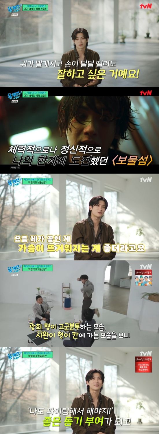 더 나아가 박형식은 '나에게 보물섬이란'이라는 질문에 대해 "결국에 제가 그리는 보물섬은 다 같이 행복하고 다 같이 사랑이 넘치는 일생이었으면 좋겠다는 게 저의 가장 큰 목표다. 제가 꽂힌 게 있는데 가슴이 뜨거워지는 게 좋더라. 광희 형이 고군분투하는 모습, 시완이 형이 칸 가고 뭐 하고 그런 모습 보면서 뜨거워지더라. '박형식 너는 못해?' 이런 것도 있었던 거 같다. '나도 파이팅 해서 나도 빨리해야지' 그런 동기부여가 되고 우리 멤버들이 잘될수록 더 행복하고 이상한 그런 게 있다"라며 진심을 드러냈다.