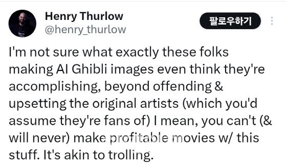 또 다른 원피스 TV 시리즈 일부를 연출했던 헨리 서로우도 최근 자신의 X 계정에 “AI 지브리 이미지를 만드는 사람들이 원래 아티스트를 불쾌하고 화나게 하는 것 외에 정확히 무엇을 성취한다고 생각하는지 모르겠다”며 “이것은 수익성 있는 영화를 만들 수 없고 트롤링과 비슷하다”고 불쾌감을 표시했다.