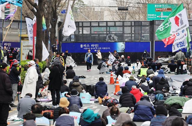 헌법재판소의 윤석열 대통령 탄핵심판 선고를 이틀 앞둔 지난 2일 오후 서울 종로구 안국역 일대에서 헌법재판소로 향하는 도로에 대형 폴리스라인이 설치돼 있다 / 뉴스1 / 뉴스1