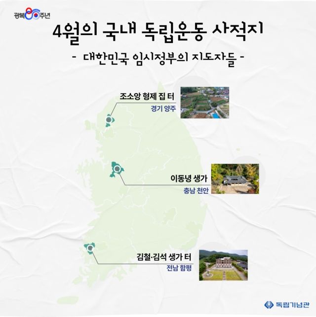 독립기념관(관장 김형석)은 2025년 광복 80주년을 맞아 4월의 국내 독립운동 사적지로 대한민국 임시정부(이하 임정) 수립과 활동을 이끈 핵심 지도자들의 흔적이 담긴 세 곳을 선정했다고 밝혔다.