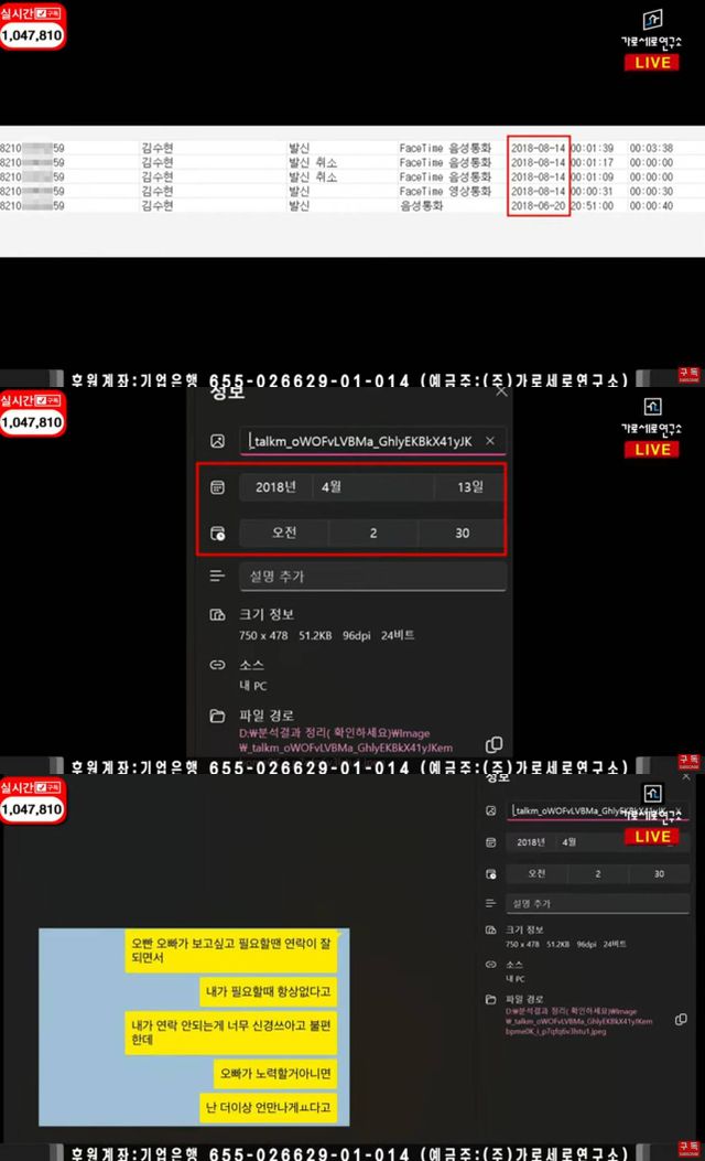 가세연은 "저희가 핸드폰 5대 노트북 4대 이거말고도 테블릿 같은것도 포렌식 마쳤다. 대한민국에서 제일 큰 포렌식 업체에 맡겼다. 김수현씨 핸드폰 번호 다 있다. 예의상 모자이크했다. 페이스타임, 통화 아주 일부만 보여드리는 것"이라고 말하며 통화내역을 공개했다.