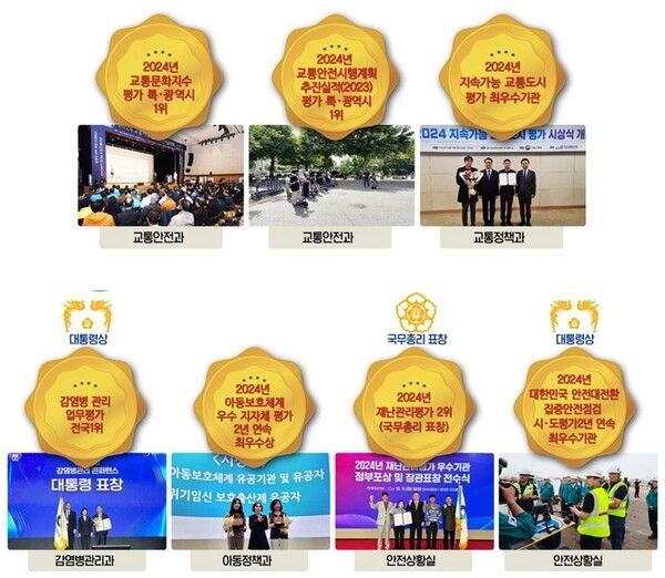 또 ‘2024년 지역교통안전시행계획 추진실적 평가’에서도 ▲교통사고 발생 건수 최저 수준 기록(인구 10만 명당 258.42명으로 전국 최저) ▲교통사고 사망자 수 감소(인구 10만 명당 2022년 3.2명에서 2023년 2.8명) 등 교통사고를 줄이기 위한 지속적인 노력은 인정받아 8개 특·광역시 중 1위를 차지했다.