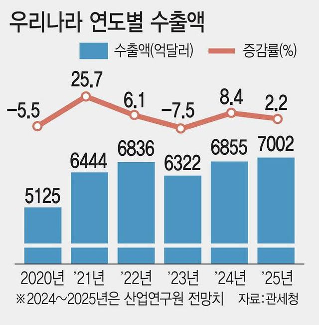 한국은 지난해 사상 최대인 6855억달러를 수출했고, 정부는 올해도 수출 7000억달러 이상(산업연 7002억달러)을 목표로 삼아 왔는데, 기존 최악 시나리오 플러스 알파(α) 500억달러 이상 수출이 줄어들 수 있게 된 것이다.