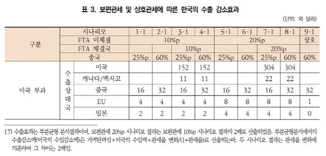 대외경제정책연구원(KIEP) 역시 비슷한 시점에 9개 시나리오별 분석에서 대미 수출이 152억~304억달러 줄어드는 것을 포함해 전체 수출액이 53억~448억달러 감소할 수 있다고 봤는데, 당시 최악 시나리오가 모든 국가에 대한 20% 관세 부과(중국 60%)였던 만큼 실제 수출 감소액은 이보다 커질 수 있게 됐다.